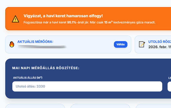 Az alkalmazásba akár naponta is rögzíthet adatot, ha pontosan követni szeretné a fogyasztását és költségeit főleg egy hidegebb téli időszakban. Ezután akár a félidőben tudni fogja hogyan áll a havi kedvezményes limithez képest, és mennyi van még hátra a limitből.